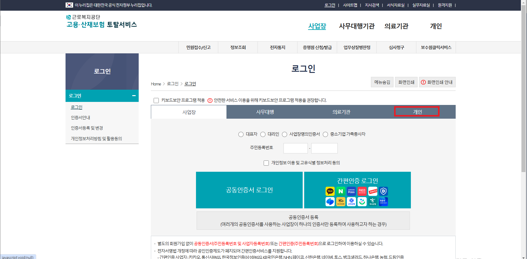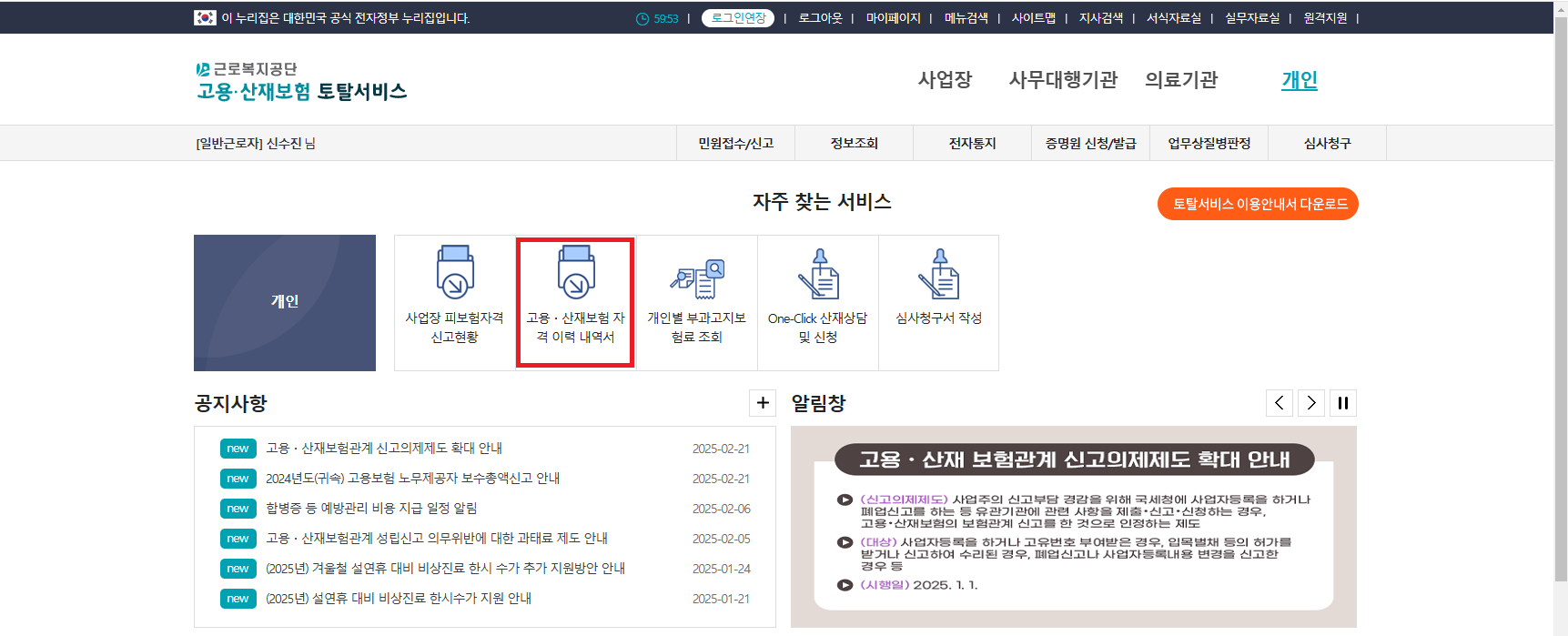 ③ [개인] → '고용·산재보험 자격이력 내역서' 클릭