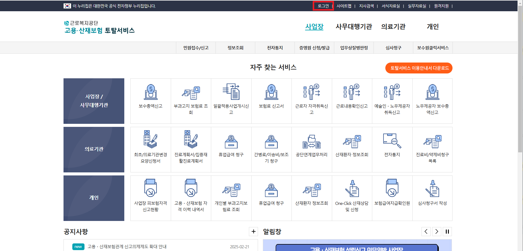 ① 근로복지공단 고용·산재보험 토탈 서비스 홈페이지 접속 https://total.comwel.or.kr/